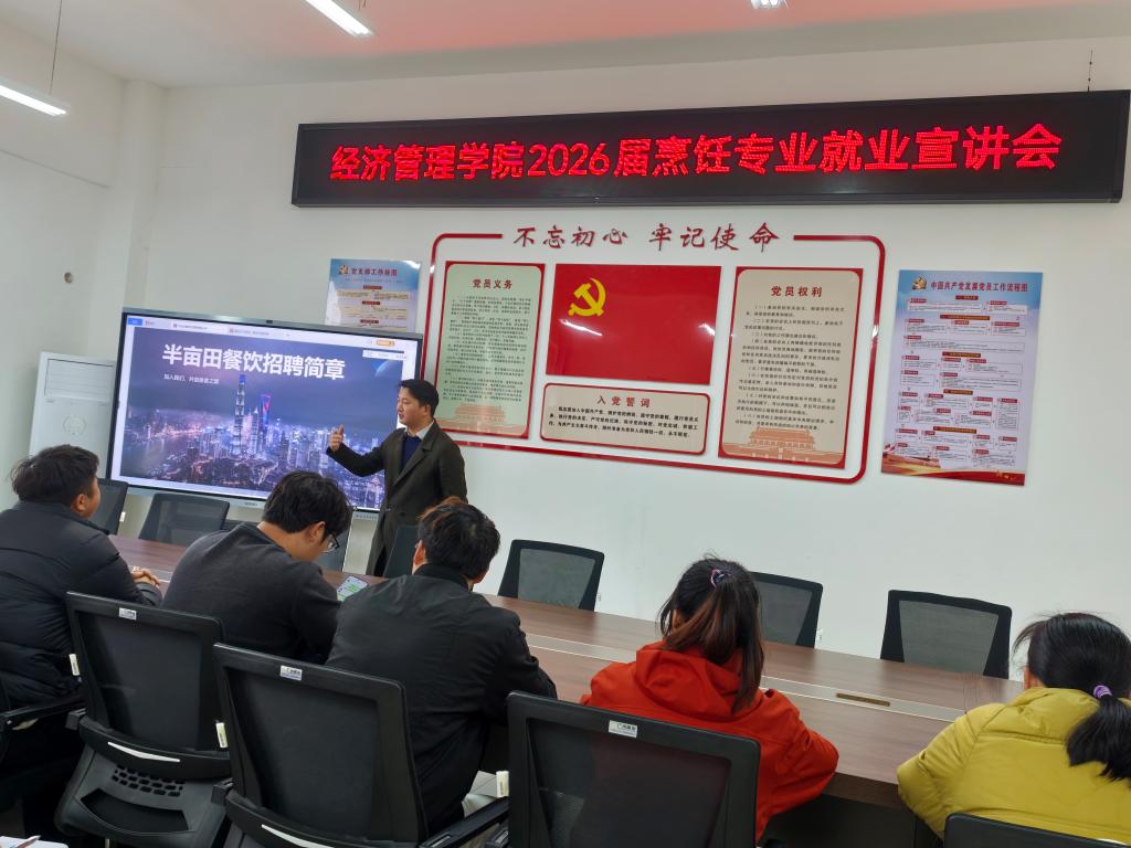 本站讯(经济管理学院 马思源)为深入推进产教融合、校企合作,精准对接餐饮行业人才需求,助力2026届烹饪专业学子明晰就业方向、拓宽就业渠道,3月23日,经济管理学院顺利举办2026届烹饪专业专场就业宣讲会。本次宣讲会特邀半亩田餐饮企业核心团队入校宣讲,学院23级烹饪班、23级面点班全体学生齐聚现场,共话职业发展,共谋就业蓝图,整场活动氛围热烈、干货满满,为学子们搭建了高效的校企人才对接平台。 宣讲环节,半亩田餐饮企业招聘负责人通过PPT演示、企业宣传片播放、实景案例讲解等多种形式,向在场学生全方位介绍了企业发展历程、品牌文化、经营理念、核心业务及未来发展规划,让同学们对企业运营模式和行业发展前景有了清晰认知。随后,负责人重点围绕同学们最为关心的岗位工作职责、薪资福利待遇、晋升发展通道、员工培养体系等内容展开详细解读,明确了烹饪、面点岗位的技能要求、职业素养标准,以及从基层技术岗到管理岗的完整晋升路径,打消了同学们对就业后的成长空间、薪资保障等方面的顾虑。 此次半亩田餐饮专场就业宣讲会的成功举办,不仅为学院2026届烹饪、面点专业学子搭建了便捷高效的就业对接平台,更深化了学院与优质餐饮企业的校企合作关系,为后续人才定制培养、实习基地共建、就业岗位定向输送等工作奠定了坚实基础。 一审:马思源 二审:毕发钱 三审:邓晶 上一条:经济管理学院开展“学雷锋 做志愿 共同奋进‘十五五’”示范性主题团日活动 下一条:经管英才 职海启航——经济管理学院顺利举办2026届就业育人促进活动
