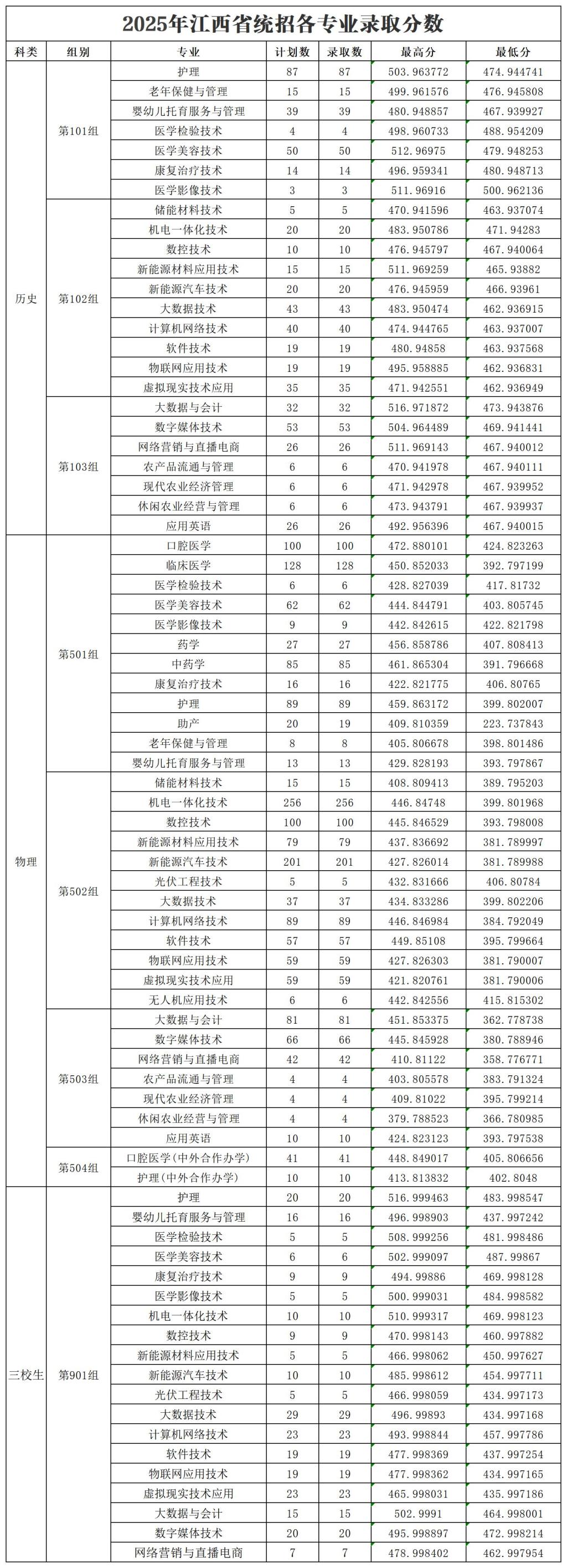 2025年江西省统招各专业录取分数
