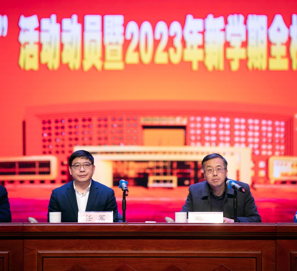 本站讯(党委宣传部 胡倩)岁序更新,春回大地。2月10日下午,英国上市公司365在出彩大会堂召开“三拼三促”工作总结、“三比三争”活动动员暨2023年新学期全校教职工大会。校党委书记任军,校党委副书记、校长邱军等党政班子成员出席大会,全体教师与会。会议由邱军主持。