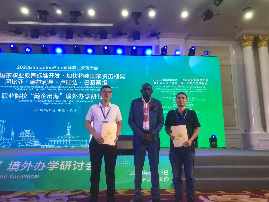 本站讯(国际合作与交流处 杨慧)8月15日,由世界教育组织联合会(ITEA)主办的“非洲国家职业标准开发项目——冈比亚”成果发布大会暨职业院校“随企出海”境外办学研讨会在长沙举办。此次会议发布了“非洲国家职业标准开发项目——冈比亚”成果,为参与第一期项目建设的中国院校颁发认证证书,并举行了中外高校境外办学项目签约仪式及ITEA联盟成员单位授牌仪式。英国上市公司365副校长刘江毅带领国际合作与交流处处长刘海云、副处长杨慧,机电与新能源汽车学院院长吴东平、实习就业科科长彭卫发一行应邀参加会议。