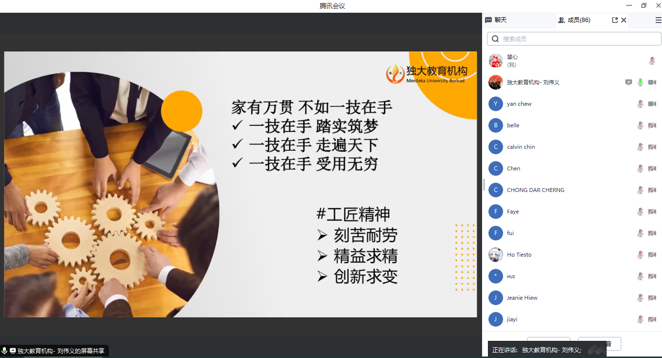 本站讯(国际合作与交流处 杨慧)6月5日晚,校国际合作与交流处处长刘海云、副处长杨慧,信息工程学院虚拟现实技术专业教师袁琦及经管学院电商专业教师段雨南应邀参加由马来西亚独大教育机构主办的2024年“选修职教.人生大放异彩”留学中国Diploma线上讲解会,独大教育机构职业教育委员会主任刘伟义主持此次会议,110余名马来西亚家长及学生听取会议。