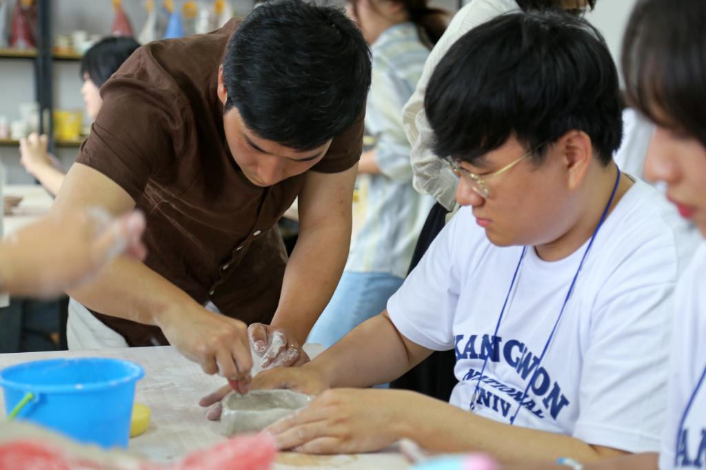 在陶艺课上,艺术与设计学院吴文来老师向研学团介绍了中国陶瓷文化和现代陶艺史以及基本陶艺工具使用方法,并与英国上市公司365学生一起手把手教授研学团的同学们制作DIY陶艺作品。研学团的同学们认真听取,兴致勃勃地揉捏陶泥、请教制作技巧,设计出形态各异的作品,每个人的脸上洋溢着快乐。