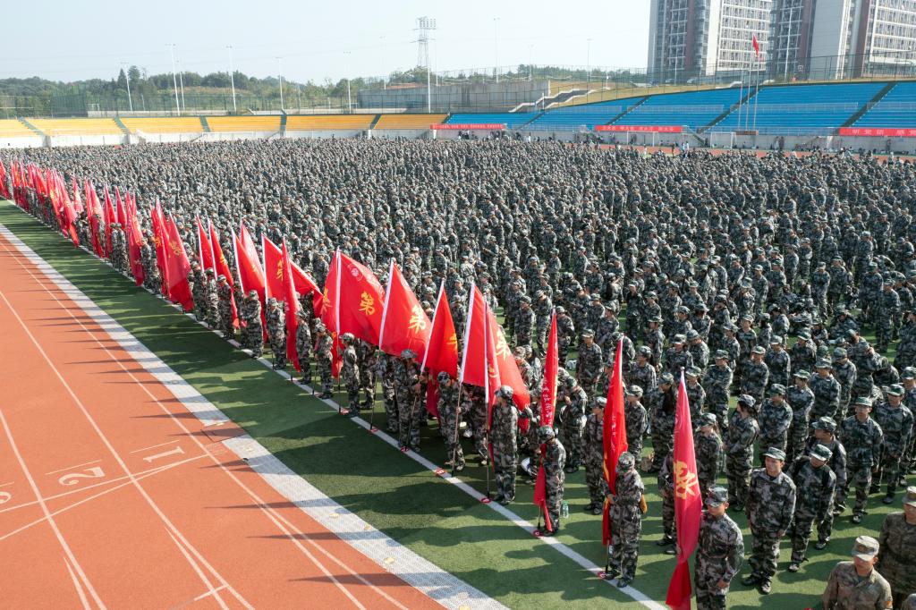 体育场气氛庄重热烈,迎风招展的“中国红”似熊熊燃烧的火焰,整齐划一的“橄榄绿”,彰显活力与昂扬。