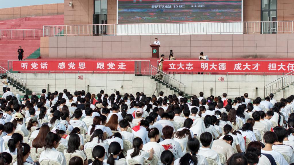 “正心修身,择善而为,品德更加高尚……”在辅导员赖培鑫的带领下,全体新生高举右拳、庄严宣誓。铮铮誓言在校园上空回荡。