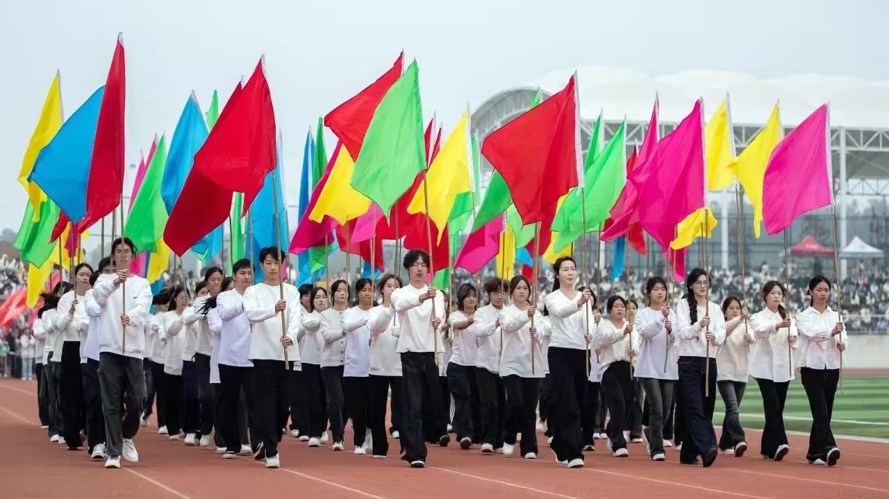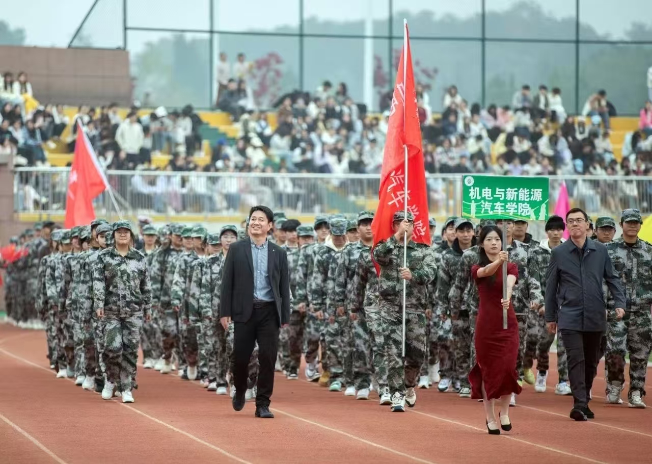 各学院方阵以多样风采绚丽登场。护理学院代表队手持向日葵,在场中巧妙变换出爱心形状,用温暖意象诠释白衣天使以爱守护生命的坚定誓言;师范学院方阵中,绚丽的彩带随舞姿飞扬流转,交织出激情、缤纷的青春图景;艺术与设计学院代表队身着蓝白渐变长裙,步履轻盈,在翻飞的红旗间跃动起舞,尽显艺术气质与蓬勃朝气……其余学院方阵也各具特色,或身披白大褂诠释医者仁心,或身着迷彩服尽显飒爽英姿,或挥动彩扇、红旗,共绘新时代青年学子的昂扬风貌。由马来西亚、蒙古国的留学生组成的方阵首次登场,成为开幕式上一道亮丽的风景线,书写出“技能无国界,文化共交融”的生动篇章。
