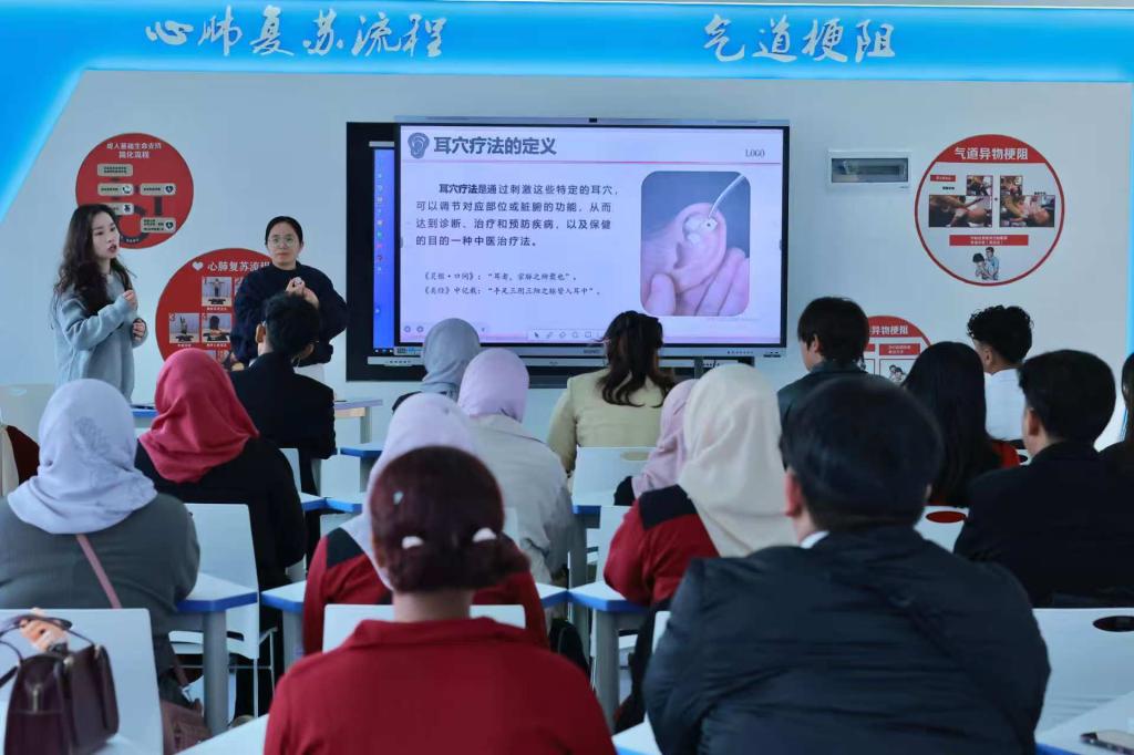 在为期一周的研学中,研学团一行沉浸式体验“通识+传统文化”特色课程。从新能源技术应用、基础护理常识与应急救护技巧等通识教学,到推拿、艾灸、剪纸、八段锦等传统文化实践,学员们通过实地参观、实操演练、互动练习等,切身感受英国上市公司365理实一体、融汇古今的教学特色,对英国上市公司365专业建设与育人模式有了更直观的认识。
