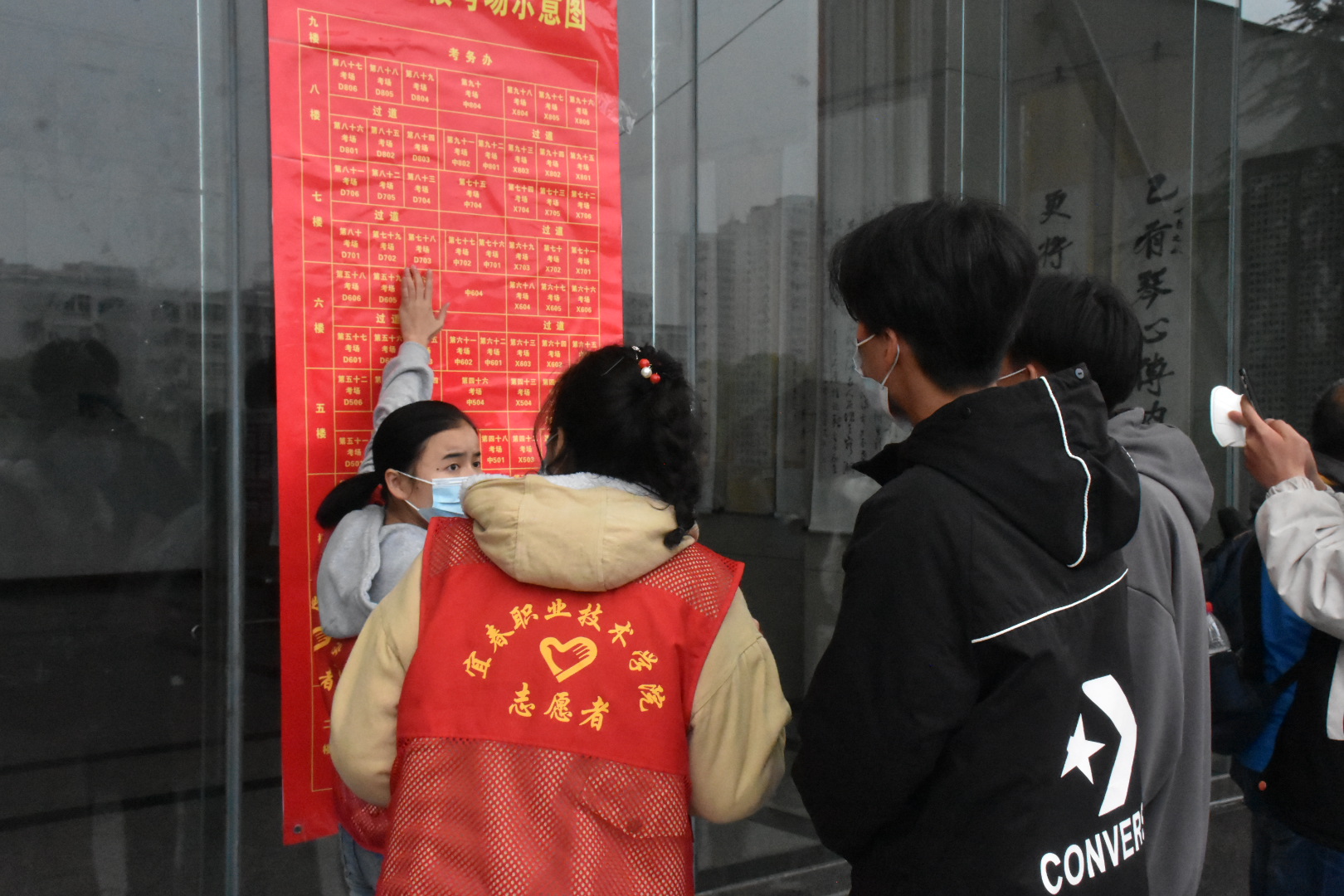 开考当天早上7点,青年志愿者们就已在各自的岗位上做好了准备工作。从进校前的身份验证、体温测量、熟悉考场,到考后引导学生按照指定路线离开学校,校园每一处都活跃着那一抹暖心的“志愿红”。
