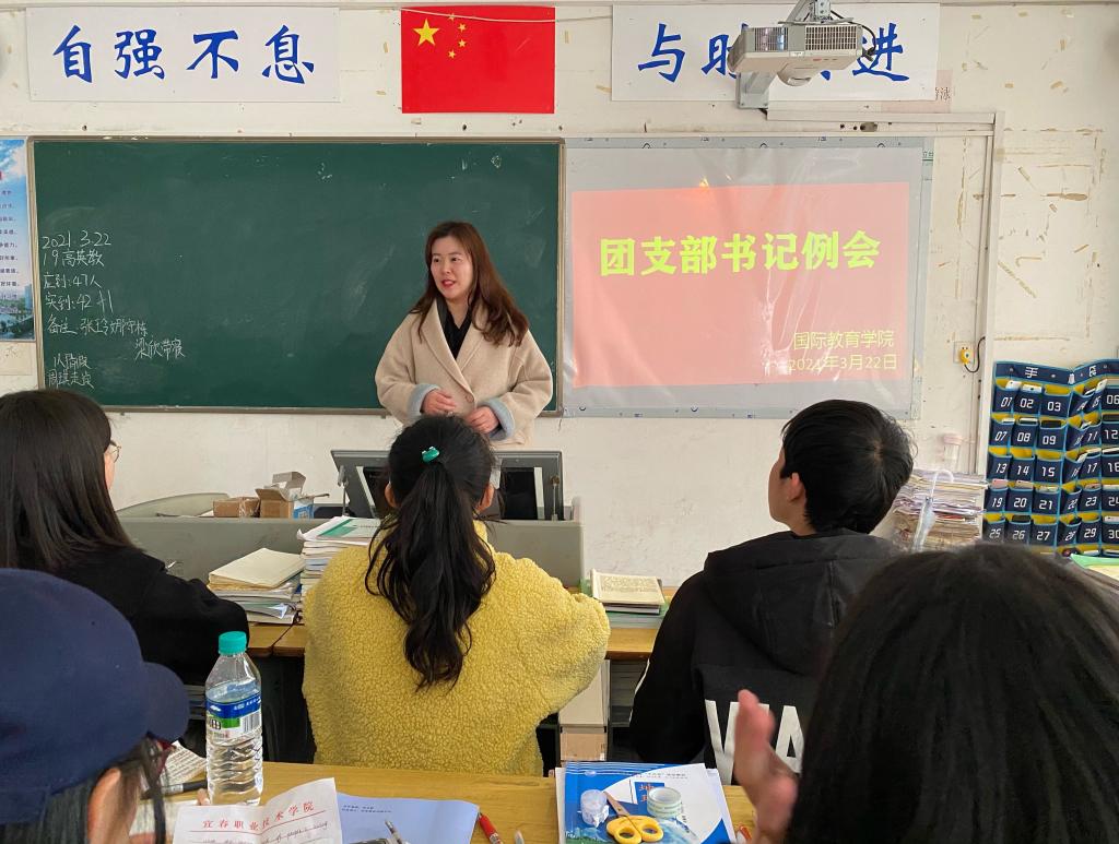 本站讯(国际教育学院 朱媛)3月22日中午11点40分,国际教育学院在第一教学楼X406教室召开了本学期第一次团支部书记例会,会议由国际教育学院团总支副书记周娇阳主持,院团总支书记朱媛和院学生会组织部负责人袁霞及各班团支部书记等30余人参加了本次会议。