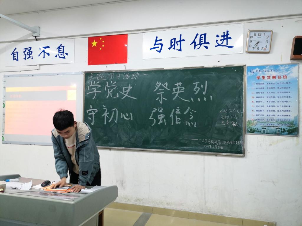 本站讯(电商与旅游学院 学生记者 严包旦)为深入学习贯彻党的十九大和十九届二中、三中、四中、五中全会精神,主动学习习近平总书记在党史学习教育动员大会上的重要讲话精神,教育广大同学充分认识到“学党史·强信念·祭英烈·传薪火”的重要意义,感悟党的初心使命,领会党的创新理论,赓续党的红色基因。2021年3月30日,我院在第一教学楼7楼所有班级举办“学党史·强信念·祭英烈·传薪火”党史学习教育主题团日活动。由电商与旅游学院各班团支书主持,全体同学积极参加活动。