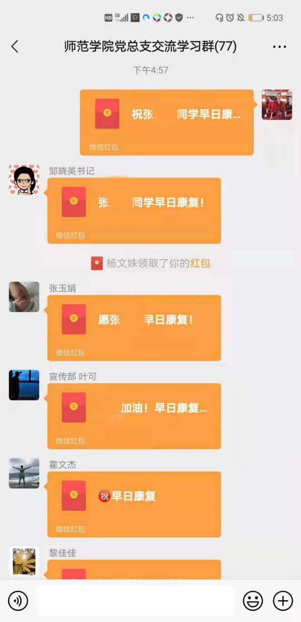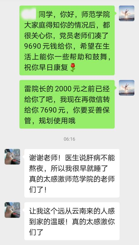得知张同学的困难处境,师范学院院长雷水龙带头先捐出2000元,立即安排她住院治疗。院领导高度重视,共商帮扶方案,师范学院党总支书记邹晓英立即向全院党员教师发起爱心捐助倡议,党员老师们了解到张同学的困难后,纷纷奉献出爱心,截止发稿,共募集爱心款9790元(含班主任捐款100元)。加上为她申请的“99助学”款1500元,两笔爱心款已全数送到张同学手上。目前,张同学在积极配合治疗,病情向好。对师范学院领导、党员老师们给予的关心帮助,张同学十分感动,执意要尽快当面感谢雷院长和各位老师。她通过微信转告老师们:“我何德何能,让老师们这么帮助我!”“真的太感谢师范学院的老师们了!让我这个远从云南来的学生感到家的温暖!真的太感激你们了!”