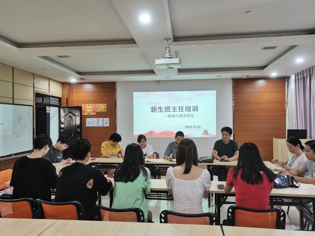 本站讯(电商与旅游学院 马思源)2021年9月24日,电商与旅游学院开展了2021年新生班主任培训活动,由党总支副书记陈小保主持,出席活动的有院长陈洪,副院长欧阳晓波,党总支书记谭育林,团总支书记余纷,学工科科长熊园园,辅导员王宁和马思源和新生班主任们。