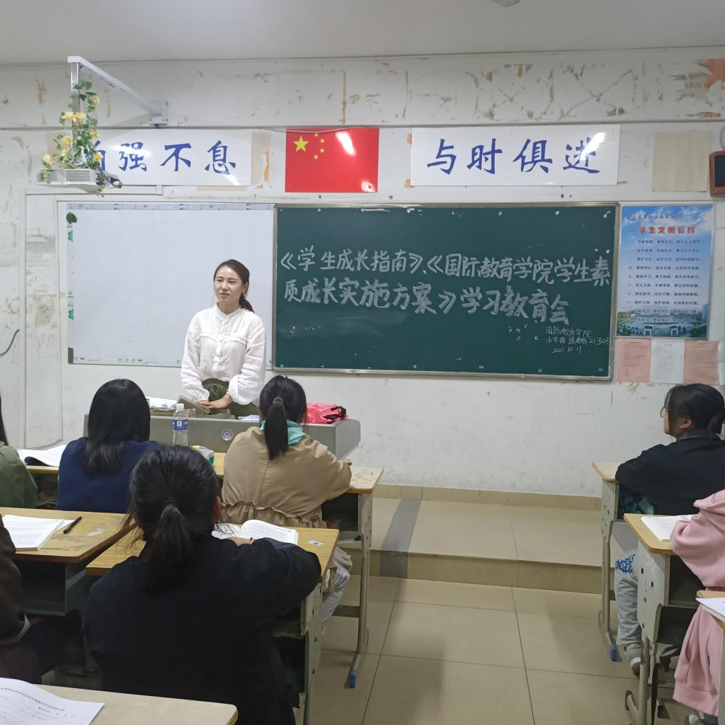 本站讯(国际教育学院 朱媛)为了帮助2021级学生更快适应校园生活,并明确自己的目标和方向,国际教育学院于10月11日晚在各新生班级教室开展了行为规范、理想目标教育专题学习会,本次专题学习由各班班主任主持,全部新生参与其中。