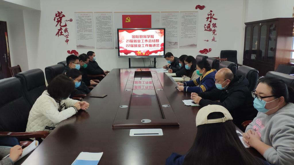 本站讯(国际教育学院 杜欣宇)为进一步推进我院就业工作的长远发展,3月22日下午学院在科技综合楼401召开2021届就业总结暨2022届就业工作推进会。院长韩菁、党总支书记刘海云、党总支副书记杨敏、副院长肖勇、全体学工管理人员、辅导员及相关毕业班班主任参加了此次会议,会议由学工科长杜欣宇主持。