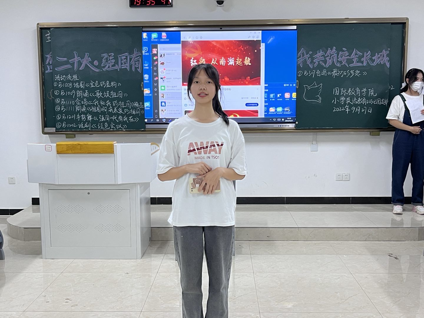 活动伊始,由团支书组织全班同学一起通过学习强国APP集中学习“唱响新时代的青春之歌——以习近平同志为核心的党中央关心青年和青年工作纪实”,号召大家始终牢记习近平总书记的殷殷嘱托,树立坚定理想信念,激发青春力量。随后,同学们以朗诵、大合唱、故事朗诵等形式,围绕国庆以及即将到来的二十大,重温党的光辉历史,激扬爱国主义热情。其中小学英语教育22304班全体同学采用大合唱及手势舞表演了歌曲《我和我的祖国》,歌声嘹亮,动作整齐划一,展现了当代青少年浓烈的爱国热情,荣获了本次主题团日活动的一等奖。