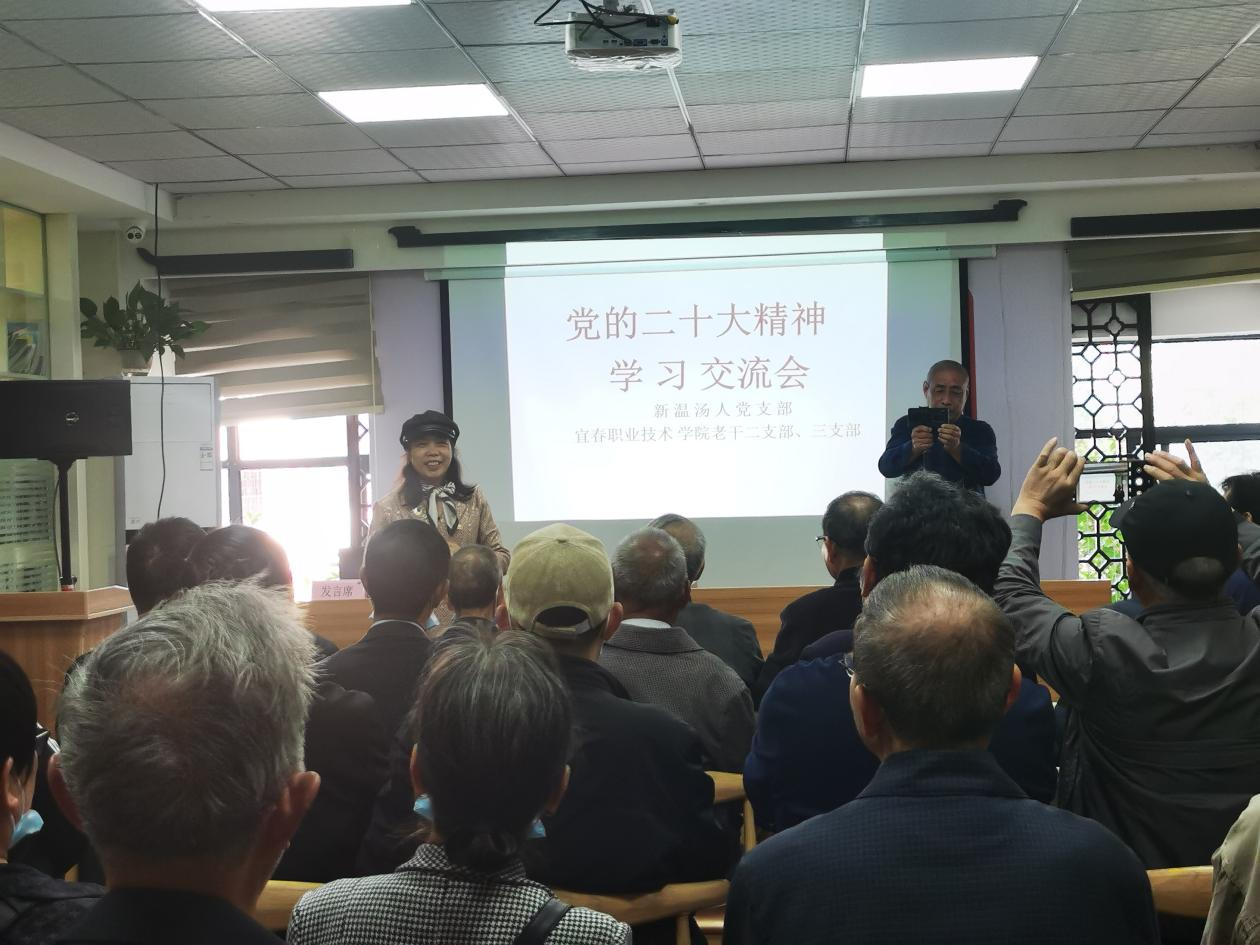 新温汤人党支部是由来自五湖四海旅居在温汤镇的离退休老干部党员组成,他们与当地老温汤人密切融合,对温汤经济发展作出了积极贡献,曾获宜春市委表彰的先进集体。在交流会上,新温汤人党支部党员介绍了在学习、文化、娱乐等方面的工作经验,互相交流了学习党的二十大的体会。通过交流进一步加深了对党的二十大的理解,决心把党的二十大精神转化为强大的精神动力,自觉地当好党的二十大精神的学习者、传播者和践行者。