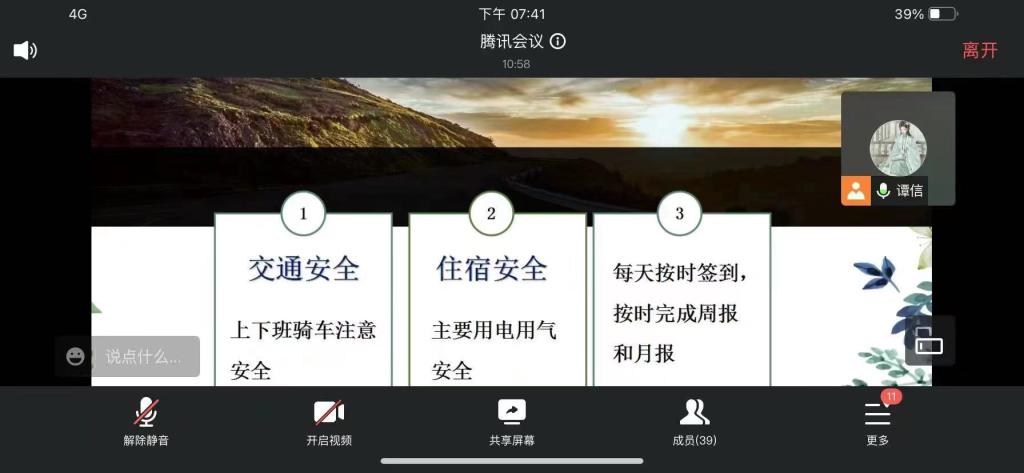 本站讯(国际教育学院 郭学琪)为进一步帮助学生树立正确的安全意识,及时进行安全隐患排查,3月3日,国际教育学院各实习班采取线上会议的方式,开展实习班级安全检查及在线安全主题班会。