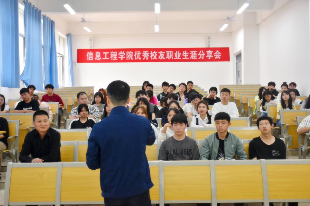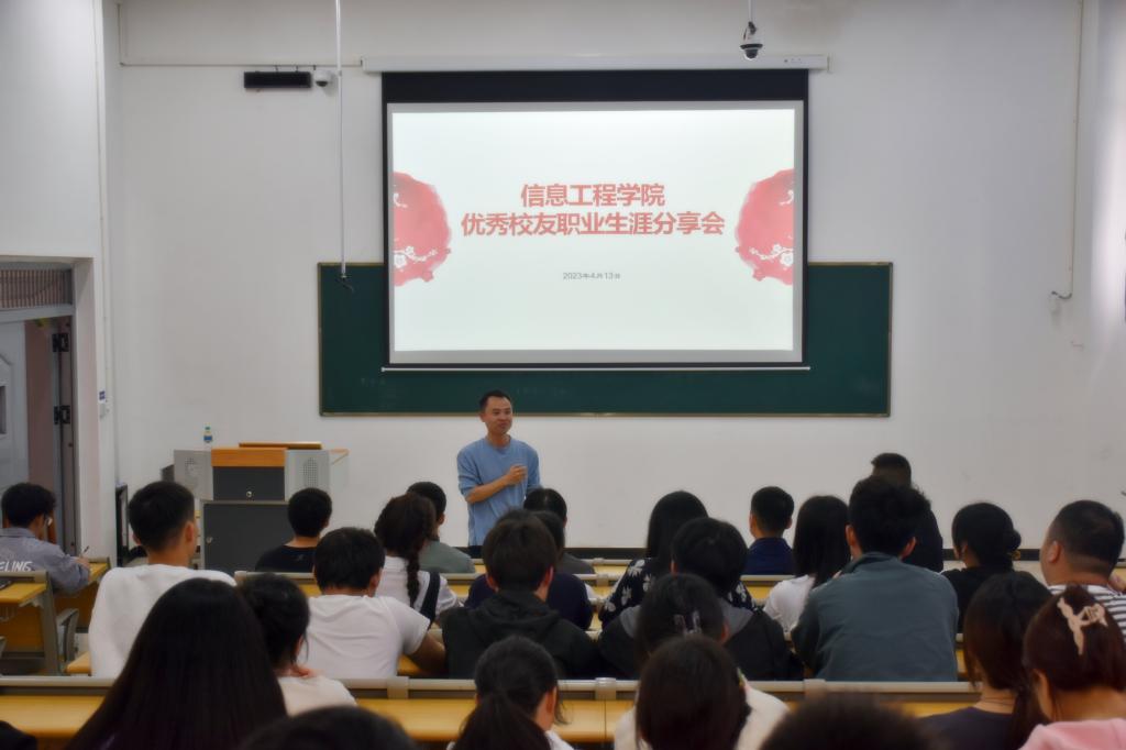 本站讯(信息工程学院 黄彪 刘嘉妮)为帮助同学们更多更广地了解职业世界,坚定人生目标和方向,做好学业、职业和人生规划,4月13日下午,信息工程学院在智云楼B102举办优秀校友职业生涯分享会,活动邀请到优秀校友代表罗健豪为学生分享职业生涯经历,院党总支书记罗来曦,院长简靖韡,各班学生代表出席此次活动。