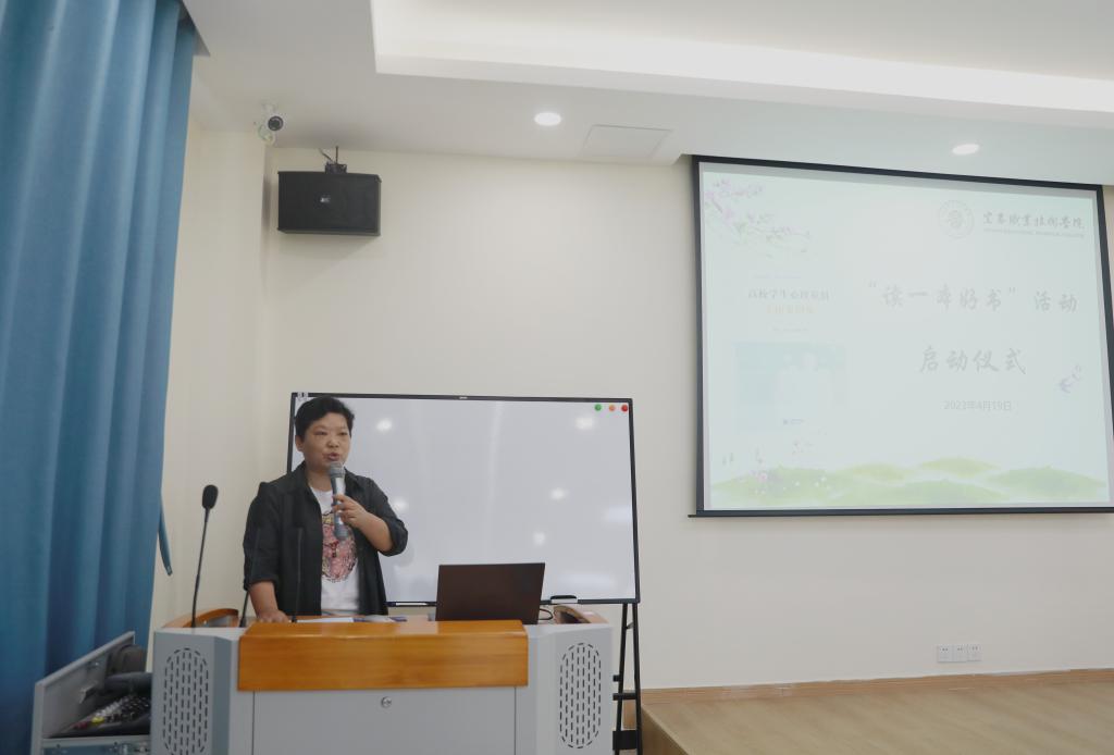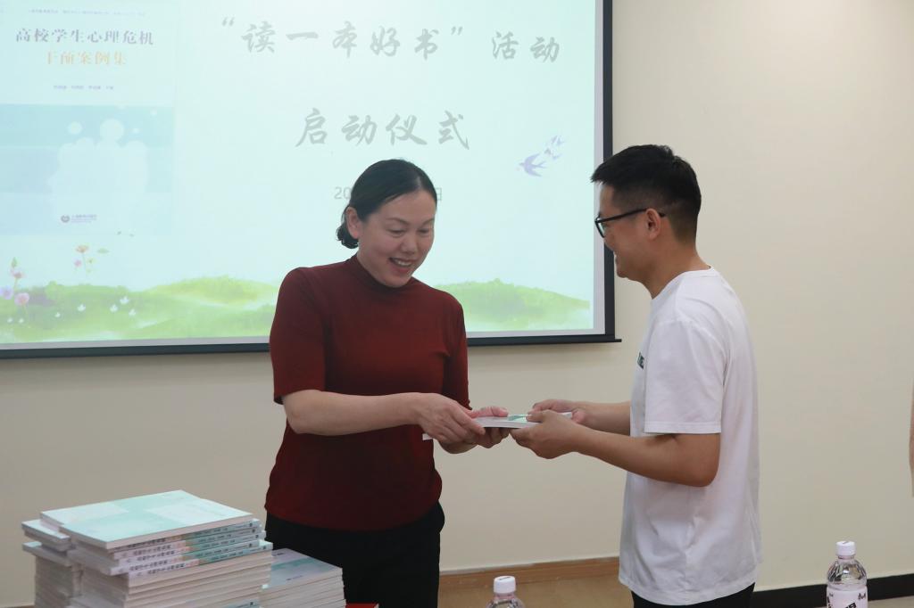 仪式上,心理健康教育中心主任席梦婷推荐好书,资助中心副主任陈雪莲宣读活动方案。