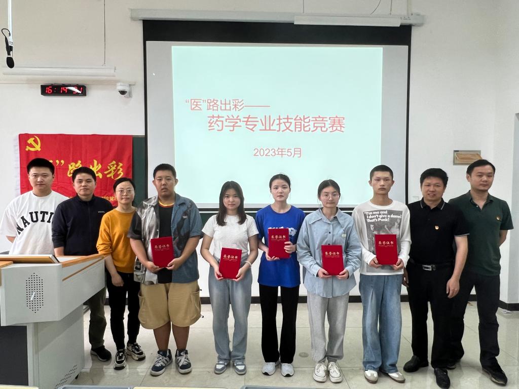 比赛分初赛和决赛两轮。初赛阶段重点考查药学专业学科基础理论和实验知识,决赛阶段通过综合性、设计性实验考察学生理论转化能力、综合实验能力,具体包括摆药和处方分析两个项目。经过赛前积极动员,2021级药学专业2个班共计60余名学生参加初赛。根据学生的综合表现以及专业教师共同考核,最后评选出一等奖1名,二等奖2名,三等奖3名。5月16日下午,医学院院长潘锋钢、副院长黄远珺为获奖选手颁发荣誉证书。