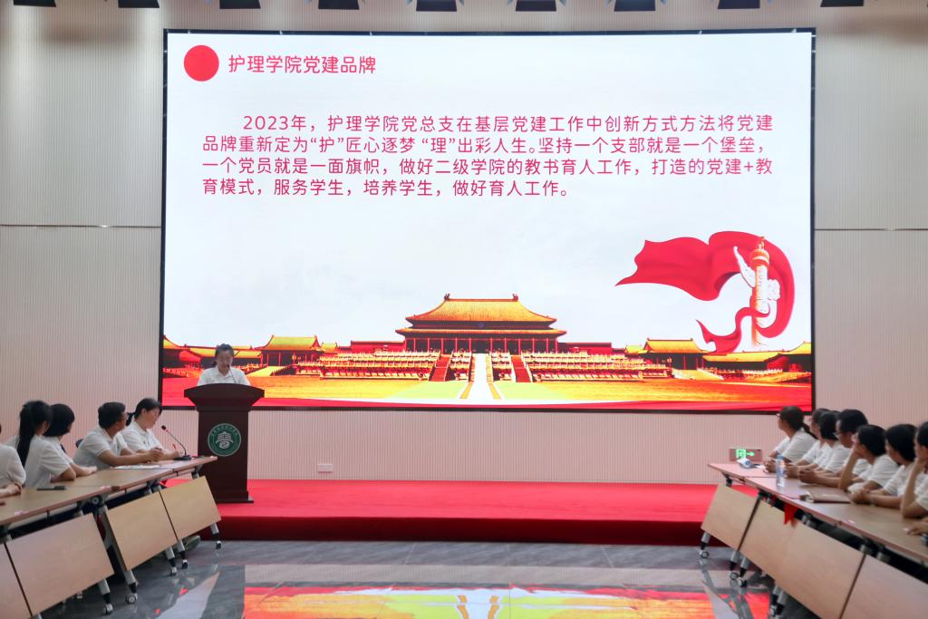 本站讯(护理学院 陈丽红)为深入学习宣传贯彻党的二十大精神,深刻领会习近平新时代中国特色社会主义思想,激励广大党员坚守教育初心,做新时代“四有”好老师,6月16日下午,护理学院党总支在天工楼学术报告厅开展“以党的二十大精神引领护理高质量发展”主题党日观摩活动。机关党委专职副书记龚莎,学校各基层党组织代表到场观看。活动由护理学院党总支书记胡蓉主持。