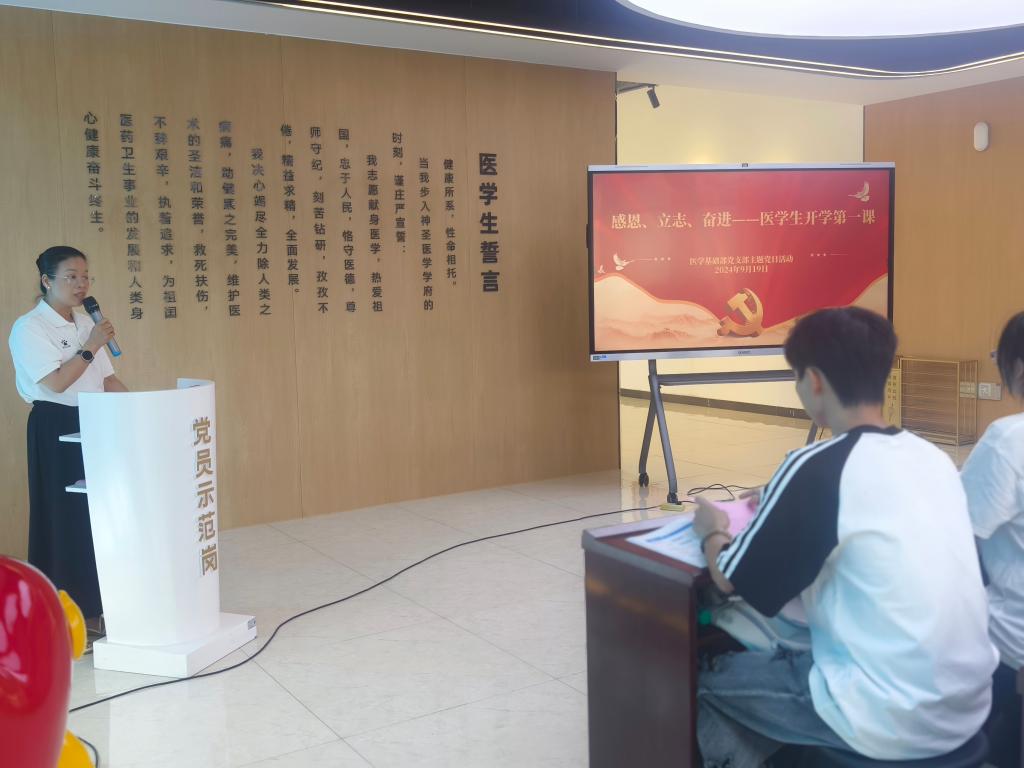 本站讯(医学基础部 尹史帝)为落实立德树人根本要求,践行“三全育人”教育理念,9月19日,医学基础部党支部将主题党日活动与医学生新生班级“开学第一课”结合,在生命与健康科学馆内开展了一场意义非凡的“感恩、立志、奋进--医学生开学第一课”主题党日活动。兄弟党支部同志到场观摩。