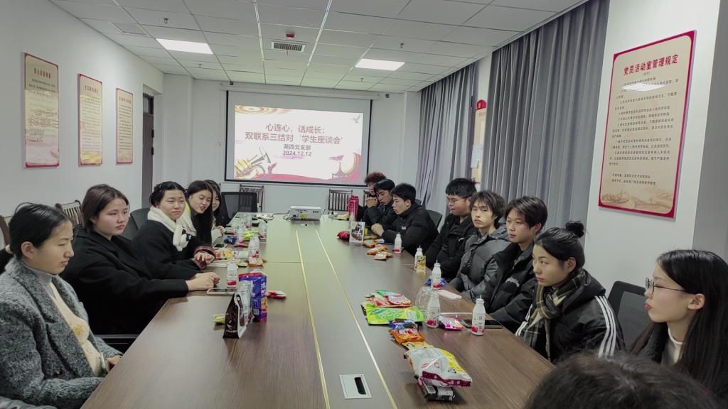 本站讯(机关第四党支部 汪清)为进一步加强对困难学生的关注与帮扶,提升双联系三结对活动质效,12月12日下午,机关第四党支部在天工楼A806开展“心连心,话成长”双联系三结对活动。会议由支部书记彭艳飞主持,支委委员、党员教师代表和数媒设计24201班部分学生代表参与座谈。