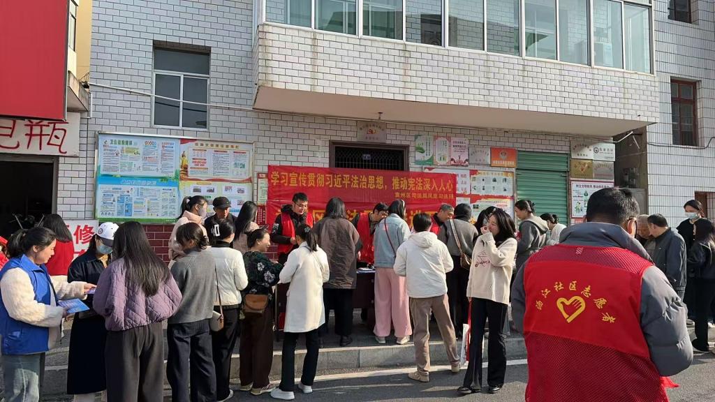 党员教师志愿者抵达沥江社区农贸市场。针对农贸市场人流量大、居民需求多样的特点,志愿者们通过设置宣传展台、发放宪法知识手册、现场答疑等形式,用通俗易懂的语言向摊主和过往居民讲解宪法基本原则、公民基本权利与义务等核心内容,重点解读与群众日常生活密切相关的劳动就业、社会保障、消费者权益保护等法律条款。面对居民提出的疑问,党员教师们耐心解答,引导大家树立“办事依法、遇事找法、解决问题用法” 的法治观念。