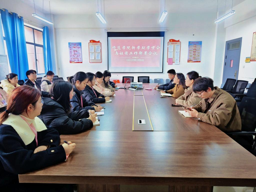 本站讯(师范学院 王焕 学生记者 龚洋涵)为统筹规划学生组织工作,凝聚学生骨干力量,3月5日下午,师范学院在正心楼党员会议室召开新学期学生会与社团工作部署会议。学院党总支书记邹晓英、党总支副书记任玉慧,团总支负责人霍文杰,辅导员王焕及院学生会骨干参加本次会议。