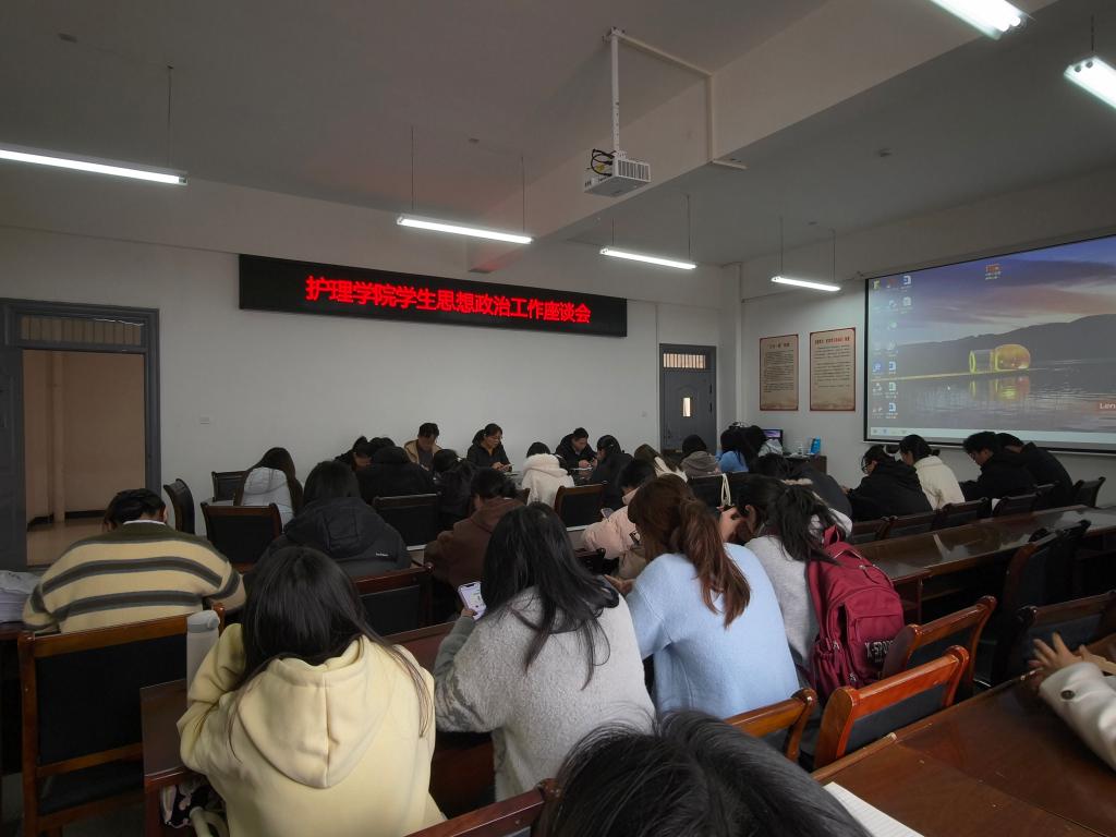 本站讯(护理学院 曲晴)为落实立德树人根本任务,统筹推进学生思想政治教育、日常管理与安全稳定工作,精准回应学生成长诉求,3月16日,护理学院在和济楼C218召开学生思想政治工作座谈会。会议由护理学院党总支副书记曲晴主持。学工科长胡祖昌、团总支书记刘小三,全体辅导员代表、各年级负责老师及在校班级团支书兼班长参会。