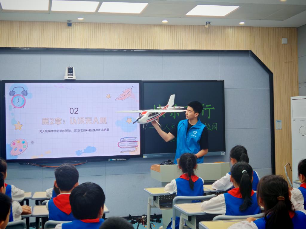 本站讯(团委 绿色新能源协会 阮丛韬)近日,绿色新能源协会“新能源、新科技、新未来”科普进校园系列活动第二站走进宜春市实验小学。协会指导老师阮丛韬、无人机专业老师杨张海带领10余名志愿者,为四年级八班学生带来一堂融合爱国主义教育与无人机科技启蒙的实践课。