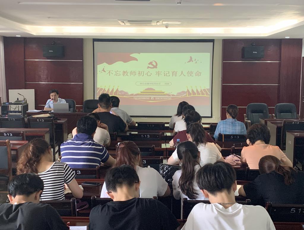 本站讯(财会金融学院 邹涛)6月20日下午,财会金融学院党总支在综合楼513召开全体党员大会,党总支书记周昊为全体党员作了题为“不忘教师初心牢记育人使命”的专题讲座,学院全体党员、学生入党积极分子参加活动。