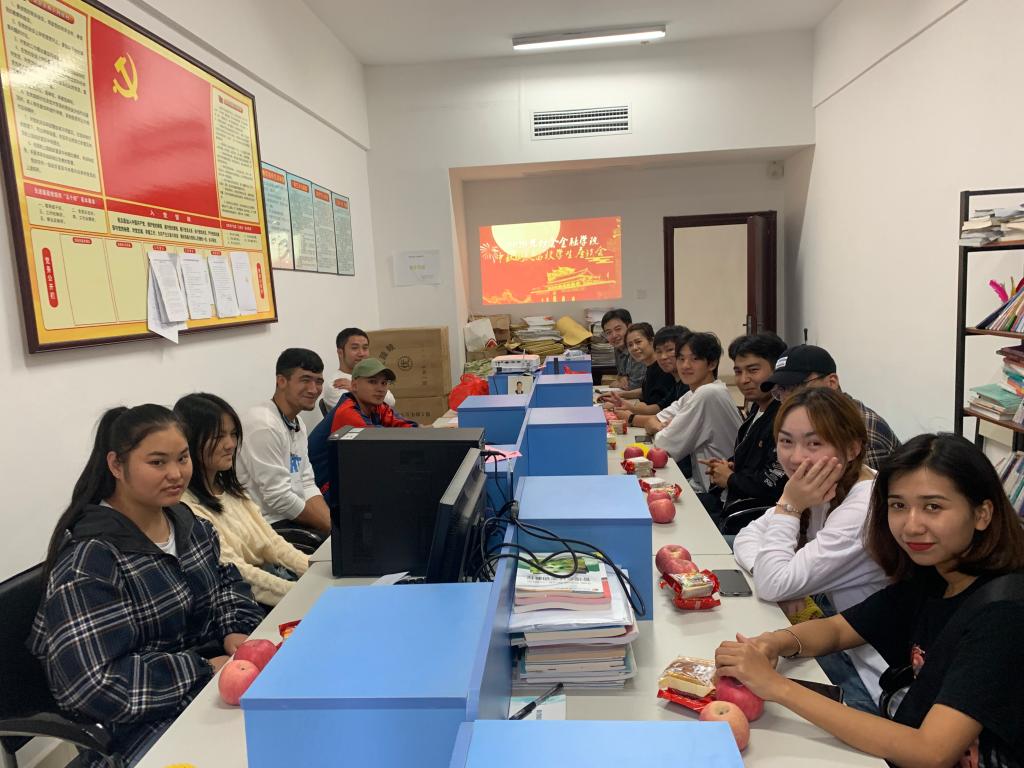 本站讯(财会金融学院 邹涛)正值国庆中秋双节到来之际,9月30日下午,财会金融学院党总支书记周昊、副书记邓晶、班主任颜颖、邹涛在科技综合楼512会议室,召集17名假期留校的同学提前庆祝国庆中秋节。会上,周昊、邓晶发了月饼和水果,送上了节日的祝福和问候,并重点强调了假期留校的安全纪律要求。在愉快的交流和关切的嘱咐下,座谈会圆满落幕。