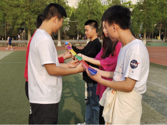 接着进行游戏2——传递能量球。两队分别挑选五人依次用引导槽将乒乓球传递至杯中,不能回流和掉落。游戏进行三轮,最终“打当当”队赢得两轮积二十分,“响当当”队积十分。
