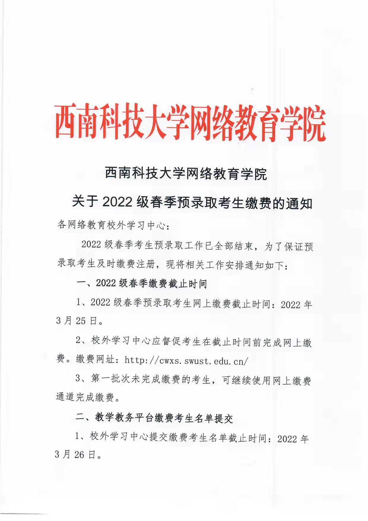 西南科技大学网络教育学院关于2022级春季预录取考生缴费的通知