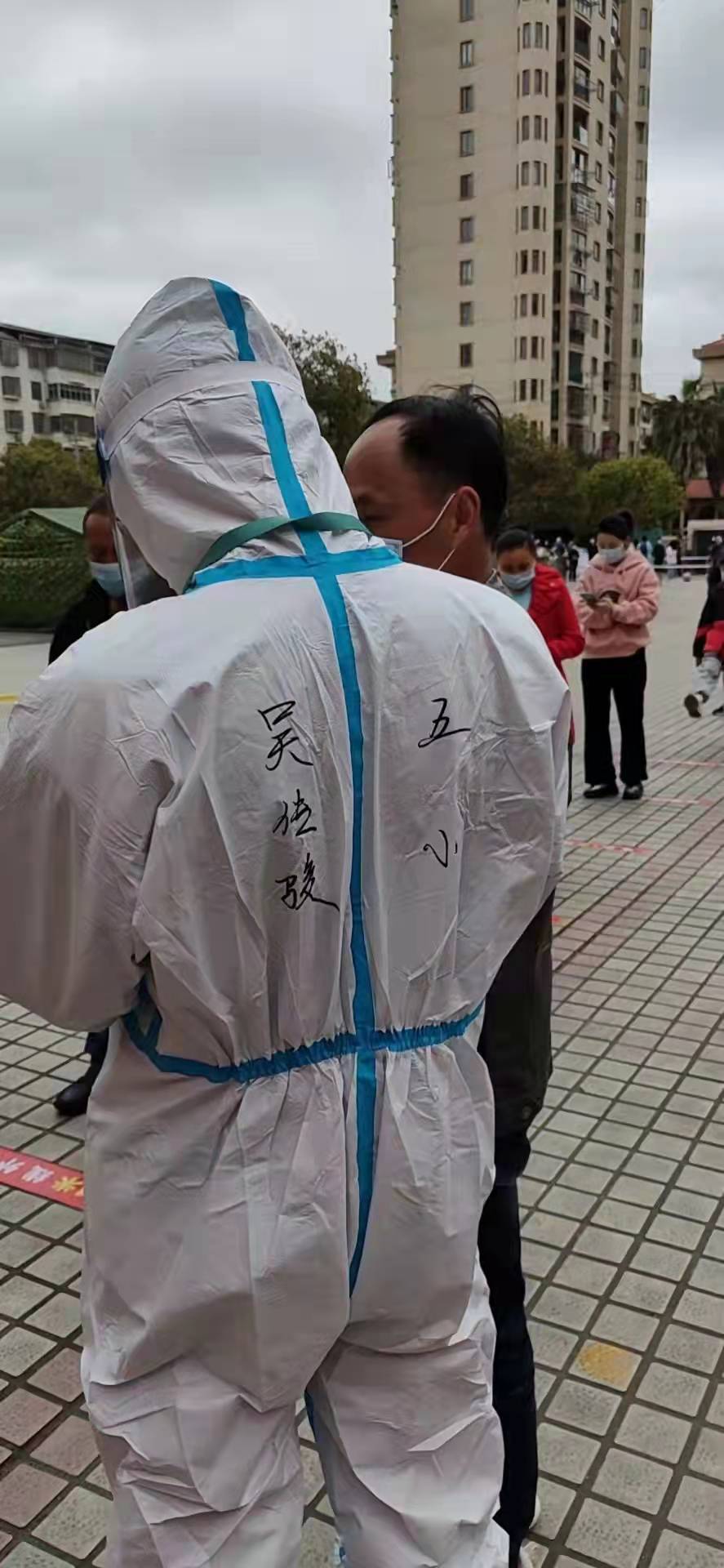 在抗击疫情的工作中,他们前后一共参与新吴社区三轮核酸检测。每一轮检测,每天天刚亮就来到检测点,帮助社区布置采样点。他们穿着防护服,在检测现场引导和分流待检人员,认真维持现场秩序,指引检测通道,为居民录入个人信息……虽然看不到他们青春的面容,但那身洁白的防护服和他们坚挺的身姿,在核酸检测现场构筑起一道亮丽的“青春防线”。