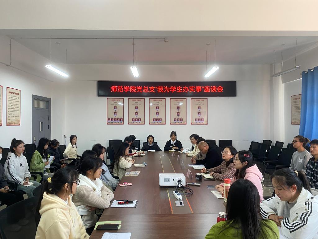 本站讯(师范学院党总支 袁旭)为深入一线倾听同学心声,助力学生成长成才,促进学校和谐发展,11月16日,师范学院党总支开展“我为学生办实事”学生面对面座谈会。本次会议由院党总支书记邹晓英主持,院长肖勇、副院长漆凡、党总支副书记任玉慧、各科室负责老师及师范学院20余名学生代表参加。