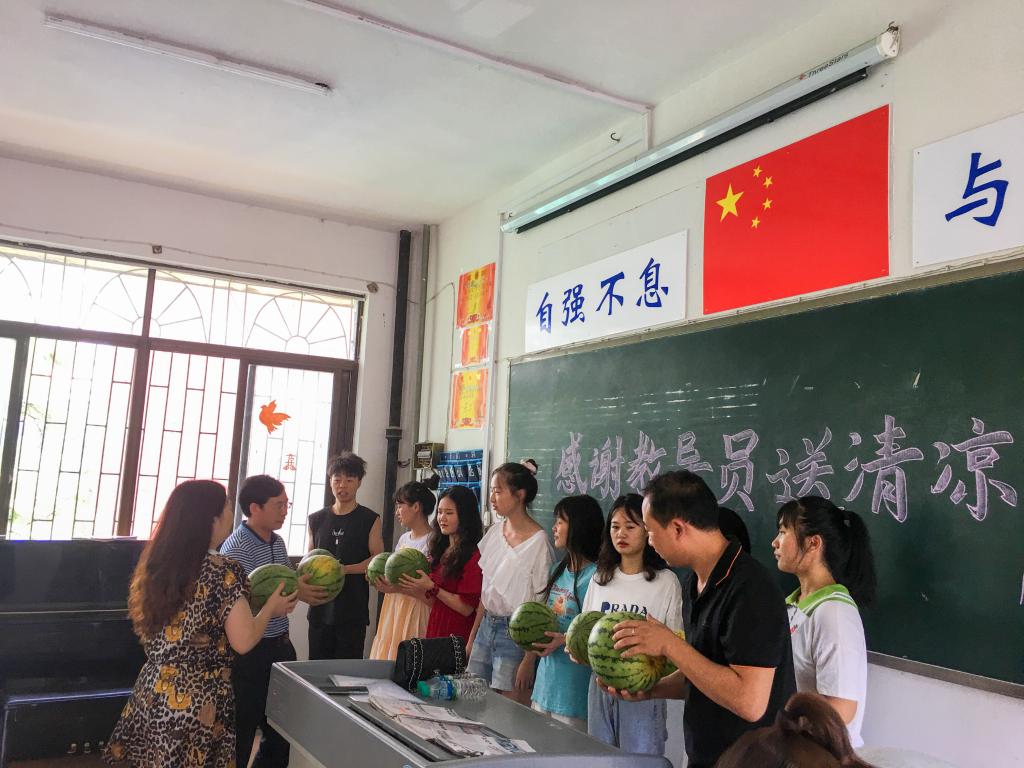 翌日,教导员来到了19大艺教,送去西塘村采购的西瓜,给学子们送来了丝丝清凉,党的浓浓关怀传递到学子们的心坎上。