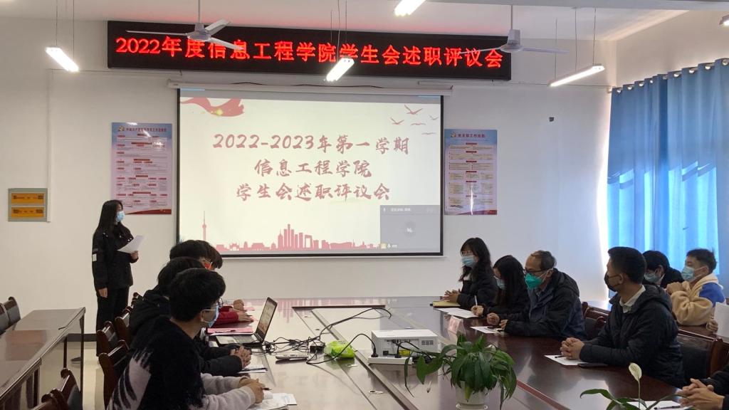 本站讯(信息工程学院黄彪 学生记者闻舒鹏)为了进一步提升学生会组织干部队伍建设,提高学生会服务水平,促进学生会工作的高质量发展,推动学生会工作科学化、规范化、精细化开展,12月14日,信息工程学院于智云楼B501举行2022-2023第一学期学生会述职评议会。参加此次会议有信息工程学院院长简靖韡,团总支书记刘嘉妮,学工科科长李纪杨,辅导员黄彪、谢小欣,院学生会成员及各班学生代表。