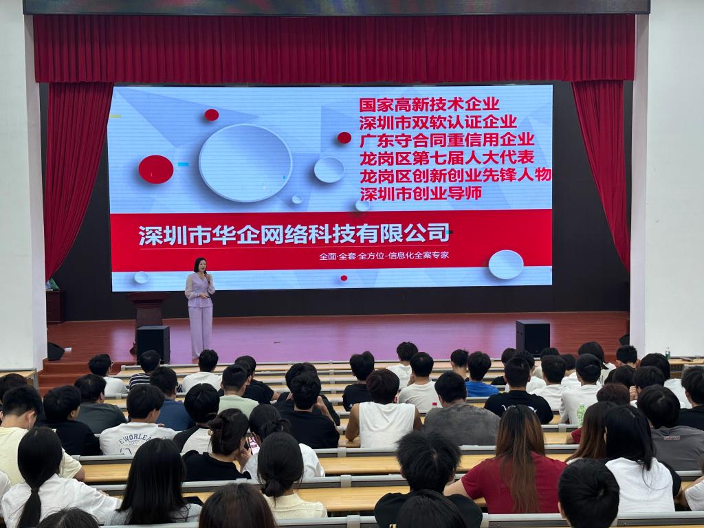 本站讯(信息工程学院 袁勋)为做好2025届实习生分配及管理工作,同时拓宽大学生就业视野,引导实习生高质量就业,5月30日上午,信息工程学院邀请深圳市华企网络科技有限公司董事长李春青、总经理陈媛萍在仁济楼小礼堂举办专场宣讲会。参加本次宣讲会的有深圳华企董事长李春青、总经理陈媛萍、副院长陈根金、综合科科长袁勋及2025届班主任和实习生。